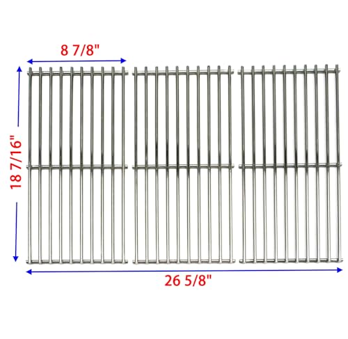 ? Direct store Parts includes 1 set of 3 Solid Stainless Steel cooking grids; Dimensions: 18 7/16" x 8 7/8" for each grid, 18 7/16 x 26 5/8 for all three grids; Material: High Quality Solid Stainless Steel;
