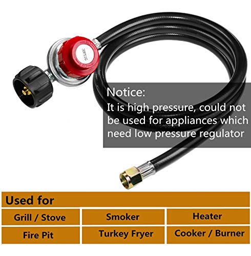Adjustable 0-30 PSI high pressure output propane regulator with 4 feet hose is a must have item for your propane burners, turkey fryers, heaters, smokers. Not suitable for appliances which need low pressure regulator.