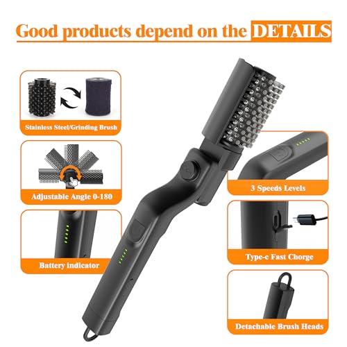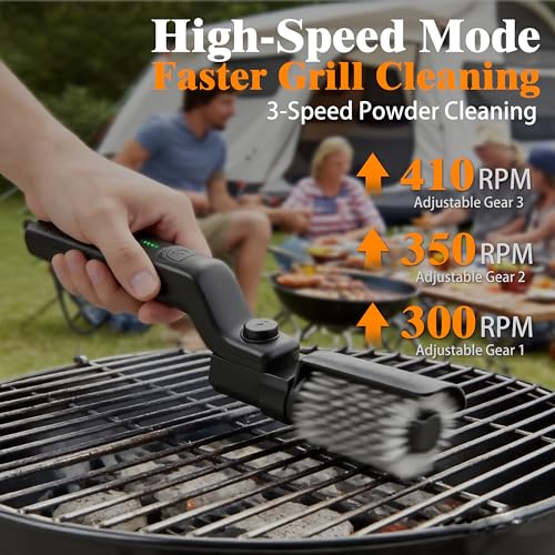 Upgraded 3-Speed Rotation Grill Brush : 3-Speed (300-350-410 RPM) power adjusting for gentle cleaning or heavy-duty grime cleaning. Low for light care, medium for regular use, high for heavy grime. All you need to do is holding the electric grill brush, no more heavy scrubbing.