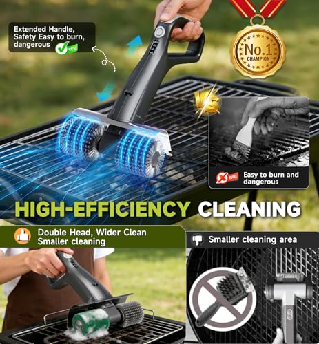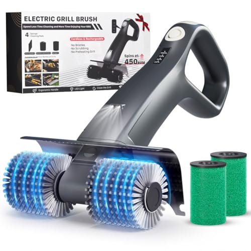 ?Dual-Speed Brushless Motor, Cuts Cleaning Time by 90%? Tackle stubborn grease on grill grates with ease! Our electric grill cleaning brush is fitted with a robust 450 RPM motor that generates high-speed scrubbing power, quickly wiping away burnt-on residue from any grill grate – it’s the ultimate automatic grill cleaning solution.An electric grill brush takes the heavy lifting out of cleaning for you, making it an essential cleaning tool for every home kitchen