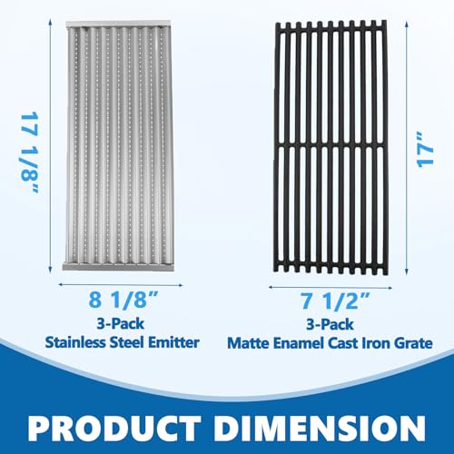 Dimensions: 3 Pack cast iron cooking grates:17 x 7 1/2" each, 17 x 22 1/2" total; 3 Pack emitter plates :17 1/8" x 8 1/8" each, Total measurement of 17 1/8" x 24 3/8", Perfect Fit 463242516 charbroil grill parts.