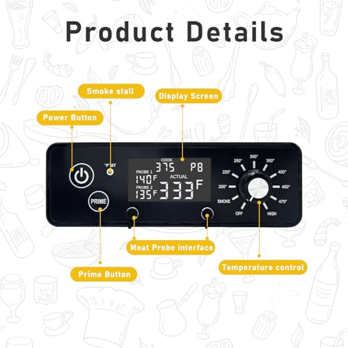 ?Specification?Eight cooking temperature settings (200 to 475 degrees) and smoke mode. You can also adjust the smoking mode through the "P" setting. AC03P9 control panel is High temperature resistance and long service life.