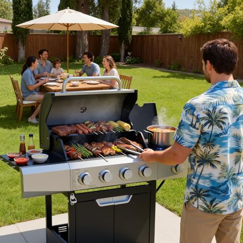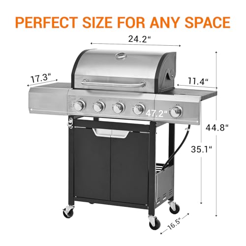 ?Professional 51,000 BTU Grilling Power?-Conquer any cookout with 4 main burners (10,500 BTU each) for fast, even heating and a dedicated 9,000 BTU side burner for sauces or sides. The total 51,000 BTU output ensures perfect searing and temperature control, making it a powerhouse for everything from weeknight dinners to large gatherings