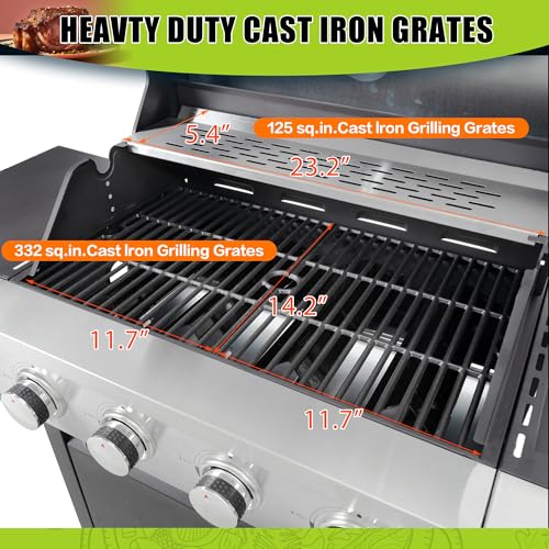 ?Porcelain-Enameled Cast Iron Grill Grates?We upgraded main cooking area grates into porcelain-enameled cast iron grates, which combines trodditonal cast iron and enamel grates advantages - heavy duty, non-stick, rust resistant and crack resistant. They will bring the cooking area more even heat when worked with the 4 stainless steel burners and enameled flame tamers.