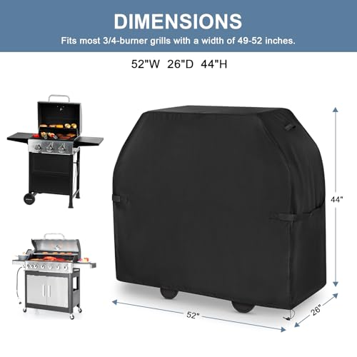 SECURE FIT PRODUCT DIMENSIONS:52"W x 26"D x 44"H, fits most 3-burner or 4-burner grills up to 52" wide. If your grill width is slightly wider than 52"(within 54") but the width plus depth is less than or equal to 76",it is still ok. The choice of grill cover depends on the size of your grill, please make sure to measure your grill.