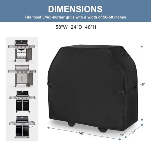 SECURE FIT PRODUCT DIMENSIONS:58"W x 24"D x 48"H,fits most 3-5 burner grills up to 58" wide. If your grill width is slightly wider than 58"(within 60") but the width plus depth is less than or equal to 82",it is still ok. The choice of grill cover depends on the size of your grill, please make sure to measure your grill.