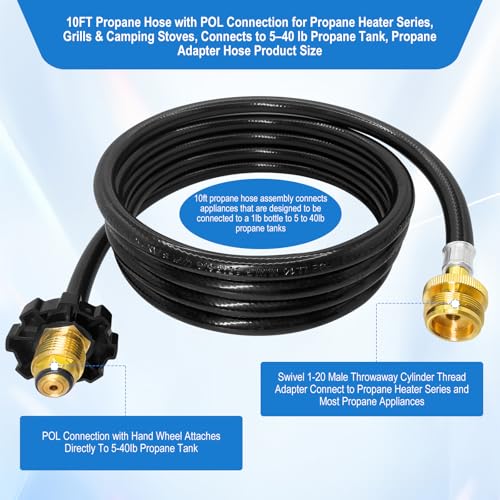 Heater Propane Hose, Big Buddy Propane Heater, Little Buddy Heater etc Propane Heater Connects 1 lb Appliances to 5–40 lb Tanks: Stop swapping tiny 1 lb cylinders every few hours. This 10-ft hose lets you hook up your heater or cooking gear to a full-size propane tank (5–40 lb), giving you longer runtime and way more convenience—perfect for home, camping, tailgating, and emergency heating.