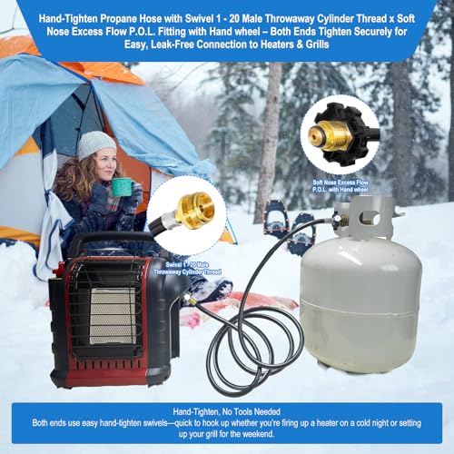 Tool-Free Setup with Easy-Turn Swivel Ends: No tools needed—just hand-tighten and you’re ready to go. The swivel design on both ends makes connecting to your heater or propane tank quick and frustration-free. The POL tank connector comes with a built-in handwheel, giving you an easy, secure fit every time without fighting stiff fittings.