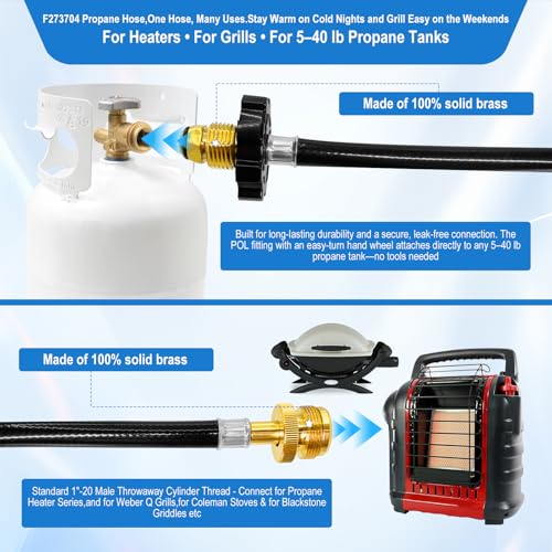 F273704 Propane Hose Wide Compatibility for Heaters, Grills & Outdoor Gear: Built to fit the Buddy Heater series—including the Portable Buddy MH9B, Little Buddy Heater, and Big Buddy Heater (a must-have for anyone looking for mr buddy heater accessories)—this buddy heater hose also works great with Weber Q-series grills, for Coleman stoves, for Blackstone griddles, fire pit tables, camp stoves, and many other propane devices. One hose, many uses.