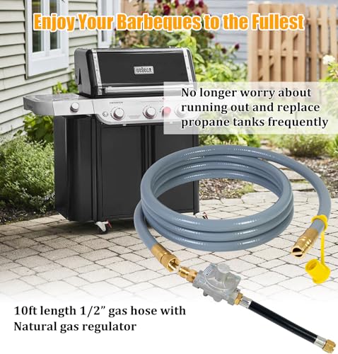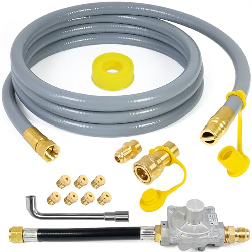 [ COMPLETE KIT ] - Includes all accessories for converting propane grills to natural gas, it comes with installation instructions, Orifices, 10ft length 1/2" Natural Gas Hose, Quick Disconnect Fitting, 1/2" Male Flare x 3/8" Female Flare Adapter, Orifice and Removal Tool, NG Pressure Regulator with Fittings Pre Installed For Easy Connection, and Teflon Tape.