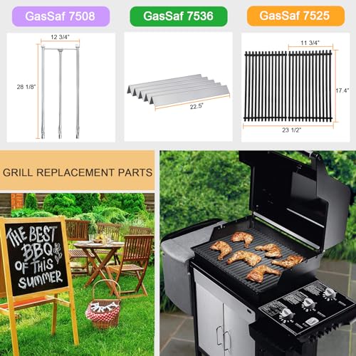 GasSaf 7508 Turner Tubes: outer burner tubes: 28 1/8 inches, center burner: 27 3/8 inches, crossover burner 12 3/4 inches. Material: stainless steel, the well-ordered holes can evenly disperse the flame and provide enough heat, make food more delicious. After sale replacements, please check and compare the size of the original parts before ordering