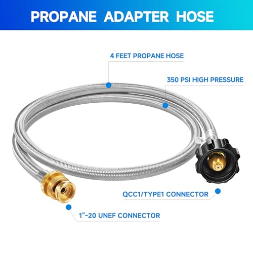 ?Product Specifications?:The 4-foot propane hose is equipped with QCC1/Type1 fitting on one end and 1"-20 disposable cylinder external thread on the other