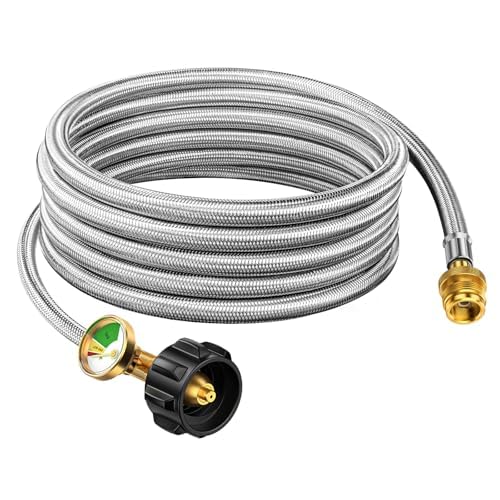 CONSISTENT GAS FLOW & CONVENIENT HOSE LENGTH - With an elaborate inner propane tank hose structure & a maximum working pressure of 350 PSI, GasXpert 12ft braided propane hose adapter guarantee a consistent & smooth gas flow to grill mouth-watering roast meat. Moreover, the lp gas hose is 12-feet long, a convenient length to connect your 1lb lp appliances to 5-40lb propane tanks at any desired distance.