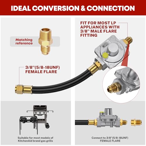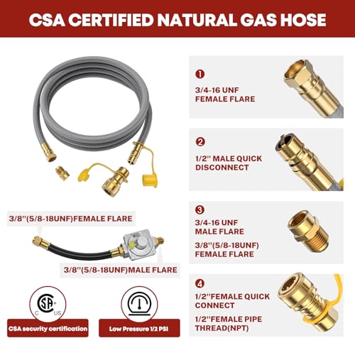 Easy to Install and Use - The natural gas conversion kit is a very easy conversion. For most kitchen aid brand propane grills, The grill comes with a conversion orifices, It just needs to remove the original propane orifice and replace the natural gas orifices. Equipped with 1/2" Quick Disconnect Plug Kit x 1/2" Female Flare Fittings, 3/8" Female Flare by 1/2" Male Flare Brass Adapter,You can quickly connect and disassemble this natural gas hose and natural gas regulator kit as needed.
