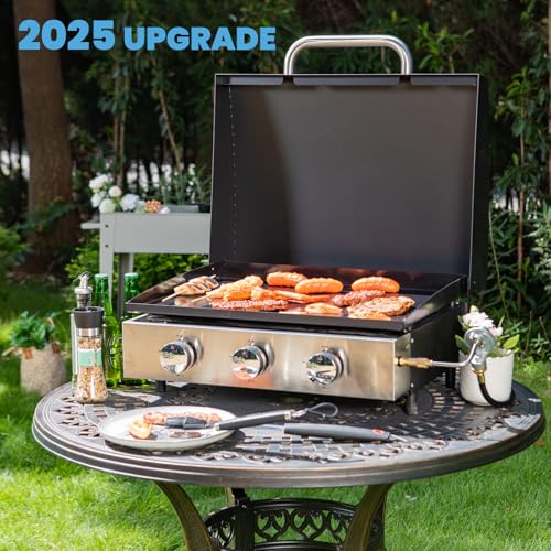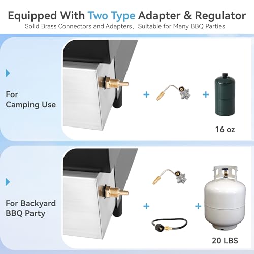 PORTABLE TABLETOP GRILDDLE: Provide a FREE regulator to use it with 1 LB propane cylinders and a hose with an adapter on it to use a 20 LB LP tank. This flat top griddle makes cooking on-the-go easy and yum!. Lightweight and ultra-portable compact size, this 3-burner griddle is great for tailgating, picnicking, or camping