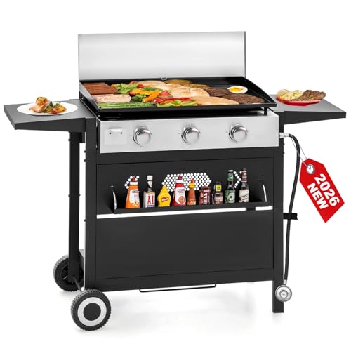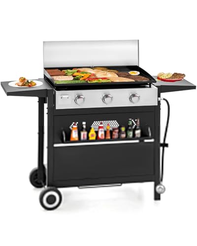 FLAT TOP GRIDDLE: The 27'' free standing griddle grill is here to improve how you cook outside. Whether it’s to the tailgate, campsite, or park, this outdoor griddle is perfect for on the go. With 450 sq inches flat top heavy duty cast iron griddle. Perfect for breakfast, lunch and dinner, cook eggs, pancakes, quesadillas, grilled cheese, steak, potatoes and more