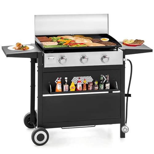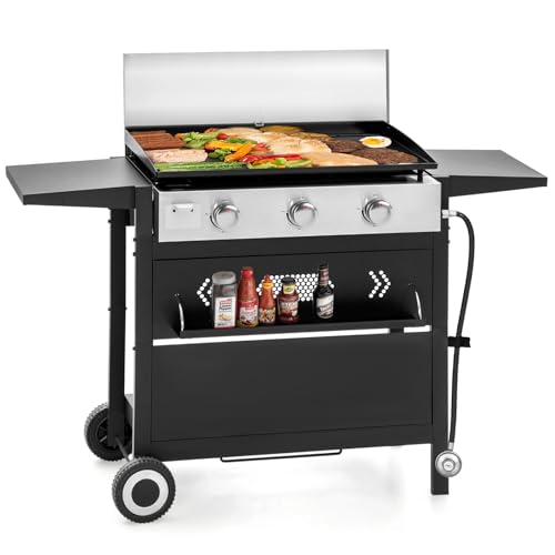 GREEN PARTY 27 inch BBQ Propane Gas Griddle, Freestanding/Tabletop Flat Top Griddle w/Ceramic Coated Cast Iron Pan, 3 Burner Lift-Off Griddle Station for Outdoor Cooking Camping Tailgating Barbecue