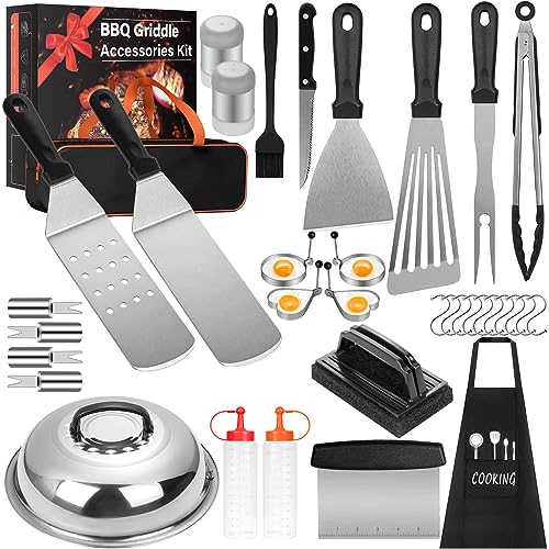 ?????????35 Pcs Griddle Accessories Kit?This grill accessories set fully meets the needs of professional grill bbq and flat top griddle grill. It includes a spatula, slotted spatula, grill tongs, grill fork, meat knife, basting brush, fish turner, chopper, scraper, basting cover, 2 sauce dispensers (12oz), 2 spice shakers, 4 egg rings, 4 corn holders, 10 hanging hooks, apron(free size), cleaning brush, carry bag