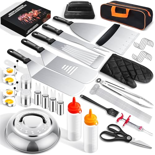 ?PROFESSIONAL 45PCS BBQ ACCESSORIES SET?This UPGRADED griddle accessories kit includes: hamburger spatula, Pancake Turning Spatula, spatula, grill fork, slotted spatula, basting cover, grill tongs, basting brush, 2 sauce dispenser, 4 egg rings, 2 spice shaker, Scissors, gloves, meat injector, cleaning Brush, fish turne,10 meat hooks, 8 meat stick, 4 Corn Holder, storage bag, exquisite packaging gift box. It can enable for any occasion and different grill types.