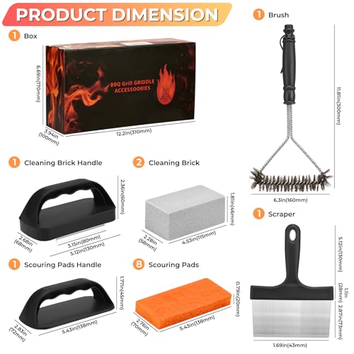 Professional Cleaning Kit: By using our griddle cleaning kit before and after cooking, it prevents your griddle from flaking and getting damaged. This griddle cleaner tool make your griddle gleaming in a short time with less effort and without any scratches. This amazing flat top grill cleaner set includes 1 griddle scraper, 1 griddle brush, 8 scouring pads with 1 handle, 2 grill bricks with 1 handle,1 which makes our griddle accessories kit for you.
