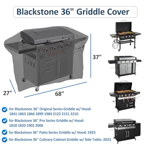 36 Inch Griddle with Hood Cover: 36 inch griddle cover measures 68"L x 27"W x 37"H, fits Blackstone original series model 1841, 1863, 1866, 1899, 1984, 2122, 2151, 2210; Patio Series model 1923; Pro Series model 1818, 1820, 1902, 2006; Culinary Cabinet Griddle with Side Table 2023; Blackstone 36" griddle 1868, 2102, 2149, 2162, 2177, 2256, 2230 and other similar models