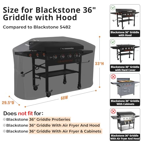 ?36 Inch 4 Burner Griddle Cover Dimension?The covers measures 68"L x 29.5"W x 33"H,fits Blackstone 36" griddle with hood/36" griddle with hard cover/36" flat top griddle and most 4 burner griddle with similar size.?Does not fit for Blackstone 36" pro series/36" griddle with air fryer & cabinets/36" griddle with air fryer and hood.?Be sure to measure your grill first to determine the proper cover size.