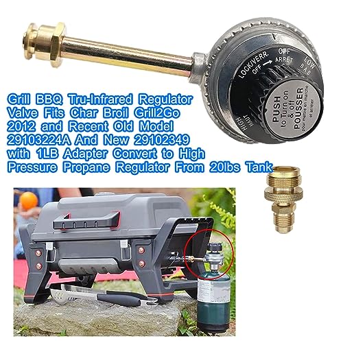 Compatible: The Regulator Valve Fits Char Broil Grill2Go 2012 and Recent Old Model 29103224A And New 29102349 with 1LB Adapter Convert to High Pressure Propane Regulator From 20lbs Tank
