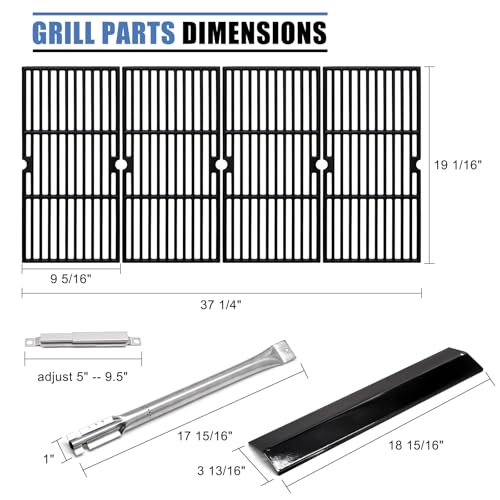 ?PRODUCT INFORMATION? - Grill Grate Dimensions: each grate measures 19 1/16 x 9 5/16 inches, 19 1/16 x 37 1/4 inches for 4pcs, Material: Cast Iron. Burner Dimensions: 17 15/16" x 1", Material: Stainless Steel. Heat Tent Dimensions: 18 15/16" x 3 13/16", Material: Porcelain Steel. Carry over Tube Dimensions: adjustable extends from 5" - 9.5", Material: Stainless Steel. Original Part Number: 1767150 grate, 1767017 burner, 1767054 heat tent , 1767018 burner carryover tube