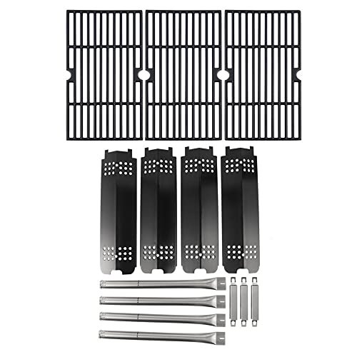 ?Compatible with charbroil 463439915 463440109 grill replacement parts. ?Please kindly check the SIZE and MODEL of your replacement parts before purchasing. ?Package: Include: Cast Iron Grill Grates x3, Porcelain Steel Heat Plates x4, Stainless Steel Grill Burner Tubes x4, Crossover Channel x3.