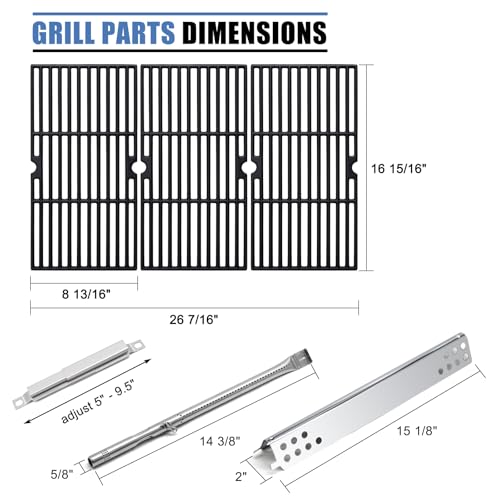 ?PRODUCT INFORMATION? -Grill Grate Dimensions: 16 15/16" x 8 13/16" for each, 16 15/16" x 26 7/16" for total, Material: Cast Iron. Heat Shield Dimensions: 15 1/8" x 2", Material: Stainless Steel. Grill Burner Dimensions: 14 3/8" x 5/8", Material: Stainless Steel. carryover tube Dimensions: adjust 5" -- 9.5", Material: Stainless Steel.