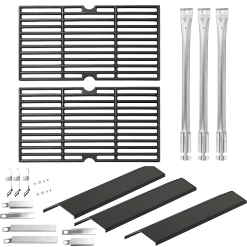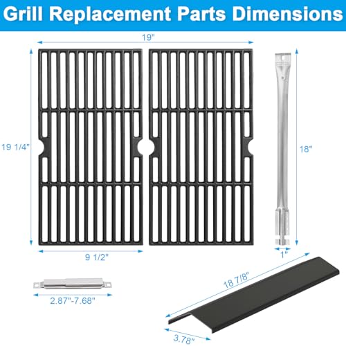 Package Includes: The grill parts kit includes 2 cooking grates (19 1/4" x 9 1/2" Each, 19 1/4" x 19" for Total), 3 heat tents (18 7/8" x 3.78"), 3 burners ( 18" x 1"), 2 adjustable carryover tube (2.87-7.68 inches) and 3 Ignitor grill parts. NOTE: Please kindly check the size and model of your grill part before order
