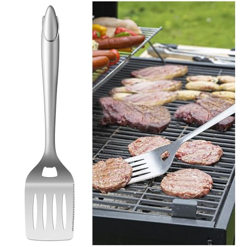 Polished stainless steel one-piece finished make clean effortlessly, features with hanging ring on the handle end that fit all grill hooks. Used as bottle opener or knife.
