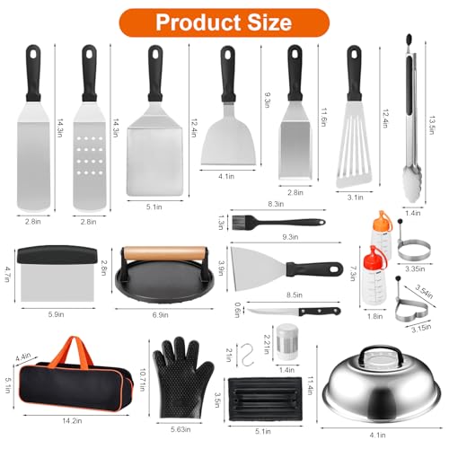 UPGRADED 35PCS GRIDDLE ACCESSORIES: This grill utensils set includes: 1* burger flipper, 1* fish turner, 1* slotted spatula, 1* long spatula, 1* extra wide spatula, 1* extra long spatula, 1* slant edge scraper, 1* dough scraper, 1* meat knife, 1* locking tong, 1* silicone brush, 1* cleaning pad, 2* basting covers, 2* squeeze bottles, 2* salt shakers, 4* egg rings, 1* burger press, 1* heat proof silicone glove, 10* hooks, 1* storage bag, 1* gift box.
