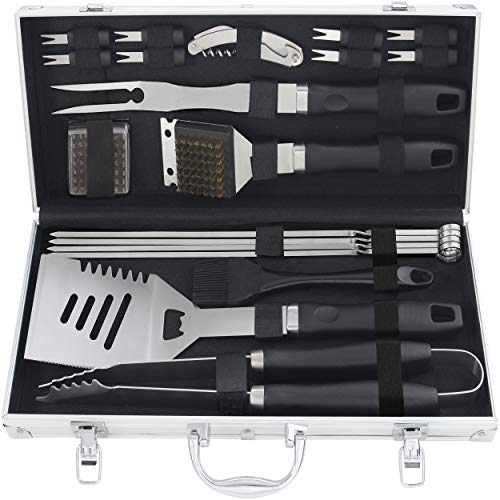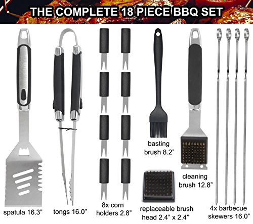 PERFECT COMBINATION: 4 in 1 spatula, power tong, cleaning brush, brush heads, silicone basting brush, 4 skewers, 8 corn holders, aluminum storage case.
