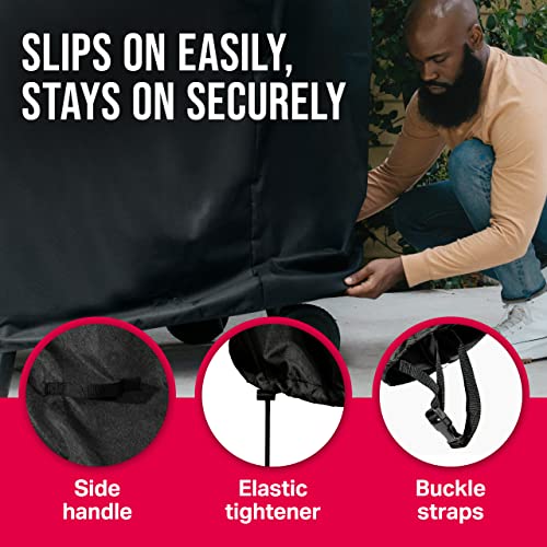 STRONG QUALITY, WIND-RESISTANT MATERIAL - Made with heavyweight PVC-coated Oxford material, this grill cover is waterproof, UV-resistant, and tear-resistant. Its elastic tightener along the bottom of the cover helps tighten the cover around the bottom of the grill, so you never worry about your grill cover being blown away when it gets windy.