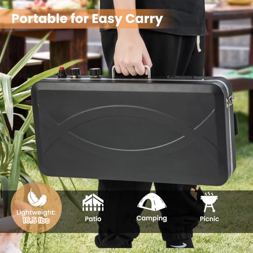Portable for Easy Carry & Details: The grill measures 23" x 11" x 25" / 58 cm x 28 cm x 63.5 cm (L x W x H) in folding size, and weighs about 16.5 lbs/7.5kg for your backyard or on the go. Handle and lockable latch also provide great convenience. Breathable air vents can accelerate air flow and heat radiation. Removable grease collector is for easy cleaning. Foldable wind guard shields the griddle from elements.
