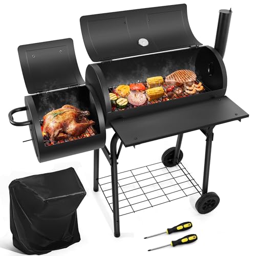 Your Best BBQ Partner: 130.sq.in of fire box and 290.sq.in of main chamber, Great for smoking, grilling, searing, baking, roasting, Ample space for cooking kabobs, steaks, cheese burgers, fishes, ribs, sausages, capsicums, corns, mushrooms, onions and more, A nice gift for yourself, family or friends, Also plus 2 strong screwdrivers for you to assemble this charcoal grill step by step