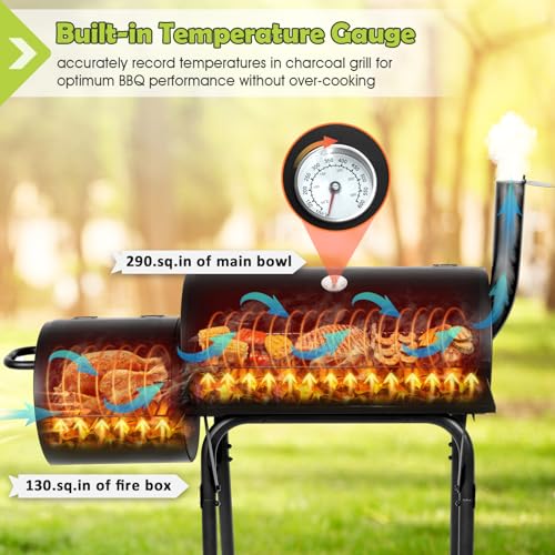 Free to Control Temperature: Built-in thermometer can accurately record real-time temperature, Clear and precise scales allow you to monitor and can avoid overcooking, Adjusting side damper and opening top chimney, to fully promote air flow, keep coals burning continuously, thus achieve optimal internal temperature, Removable charcoal pan makes ash disposal easier and more efficient each time, No more mess