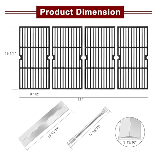 ? Packaging Details: Grill replacement parts kit includes 4 x Cast Iron Cooking Grates, Dimension: 19 1/4"x 9 1/2"; 3 x Stainless Steel Heat Plates, Dimension: 18 15/16"x 3 13/16"; 3 x burner tubes, burner tube length 17 15/16"; 2 x adjustable crossover tubes; Purchasing a grill part kit will be more cost effective than purchasing cooking grate, heat plate and burner tube separately