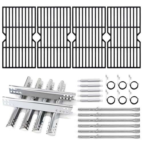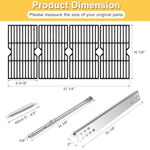 ?Package Included?- This Charbroil grill replacement parts includes: ?6 x Stainless Steel Heat Plates - Dimension: 15-1/8" x 2".?6 x Stainless Steel Burners - Dimension: 14-3/8" x 5/8". ?4 x Cast Iron Cooking Grates - Dimension: 16-7/8'' x 9-5/16" Each, 16-7/8'' x 37-1/4" for 4 Pcs Total, ? 5 x Carryover Tube - Adjust 5" - 9.5". ? 6 x Igniters