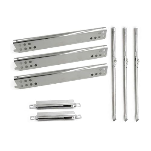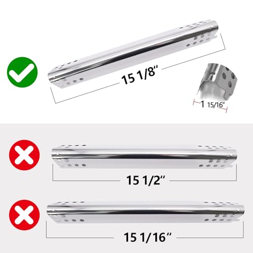 ?Dimension & Material?Burner Dimension: 14 3/8" x 5/8", Original part number Charbroil G432-8M00-W1, Material: Stainless steel. Heat Plates Dimension: 15 1/8" X 1 15/16", Original part number Charbroil G458-0018-W1, Material: Stainless Steel. Adjustable crossover tube: Adjust from 5 to 7.8 inch, Material: Stainless Steel.