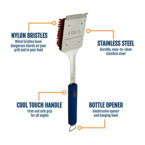 LONG LASTING SOLID CONSTRUCTION: Full tang construction makes for a more rigid tool than other conventional brushes. Offers a durable comfortable feel with ergonomic handle. The latest innovation in grill accessories are nylon bristles which keep conventional metal bristles out of your food. These metal shards cause illness and have to be surgically removed. Do Not Use regular grill brushes anymore. Safety first with IGNITE grilling Grill Brush.