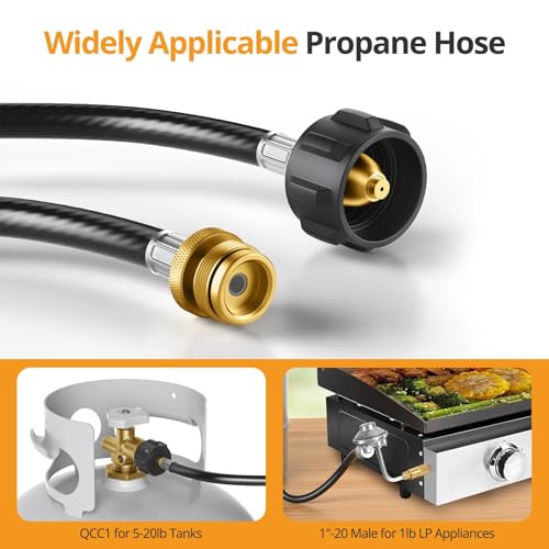 Jakivew 4FT Propane Adapter Hose for 20lb Tanks – 20lb to 1lb Converter with QCC1 Fitting, Fits Coleman Stove, Buddy Heater, Blackstone Griddle, Weber Q Grill & More