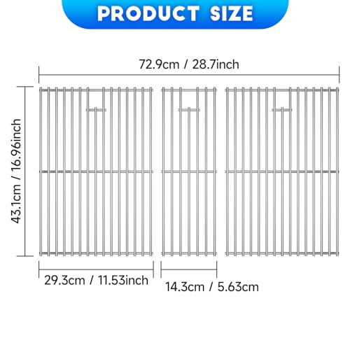 ??Multifunctional Design?This grill grate is not only suitable for various meats but also excels at cooking vegetables, seafood, and more. Its spacious design provides you with ample cooking space, Big:16.96 " x 11.53 " ,Small :16.96 " x5.63 " for each grate, 16.96inch x 28.7 inch for total, Package Included: 3 pack x Stainless steel cooking grates.