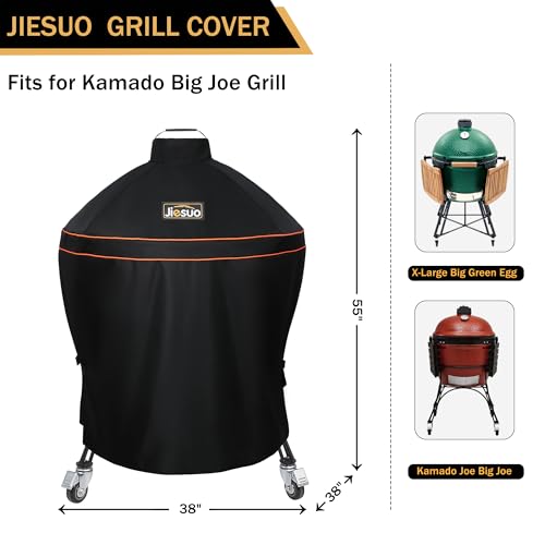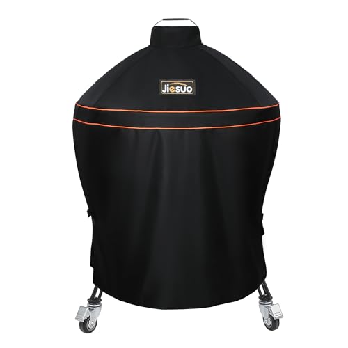 Heavy duty Material - JIESUO kamado joe grill cover is made of heavy duty 600D polyester elastic yarn, durable and tear-resistance. The PVC lining waterproof layer using an upgraded formula, adding a specific proportion of vinyl oil, making the waterproof layer soft and less crumple, more durable than other similar products.