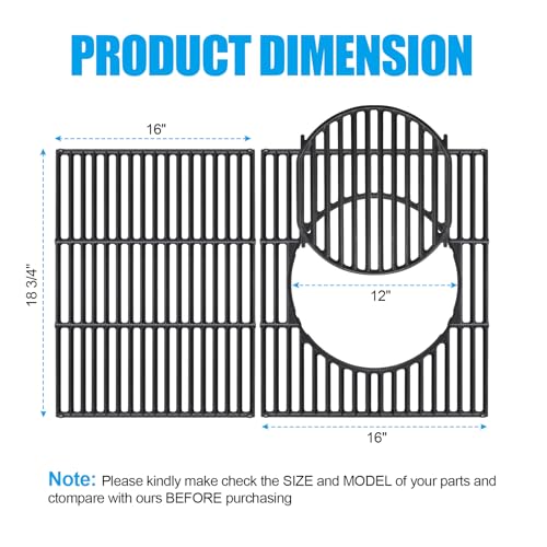 What You Get: Package include 3-pack gourmet system grates. 2 pcs rectangle cooking grates, 1 pcs round grill grid. Circular grill grate with a diameter of 12", rectangle grill grate measure 18 3/4"(L) x 16"(W) for each, 18 3/4"(L) x 32"(W) for total. Cast iron Gourmet system grates sturdy construction and heat-resistant, durable and long-lasting, high temperatures of the Weber grill. Please kindly make check the SIZE and MODEL of your parts and compare with ours BEFORE purchasing