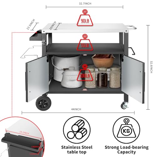 ?Outdoor Dining Cart?KENDANE big storage cabinet outdoor grill cart is made of durable stainless steel. Perfect for placing a pizza oven and accessories, portable grill or griddle; There are 650 S.Q. IN. area ample workplace for outdoor cooking, kitchen or serving.