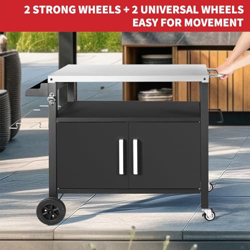 Kendane Grill Cart Table with Big Storage Cabinet, Movable Outdoor Dining Cart Pizza Oven Stand, Kitchen Cart Island Multifunction Food Prep Table Stainless Steel Surface