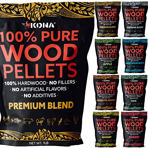 PREMIUM HARDWOODS - Only the best trees become Kona wood pellets. Experience 1 lb of each (8 lbs total) Premium Blend (Sweet Maple, Hickory, Cherry) Kona Sweetwood Blend (Sweet Maple, Beech, Cherry) Hickory, Oak, Supreme Blend, Cherry, Apple, Mesquite Acacia.