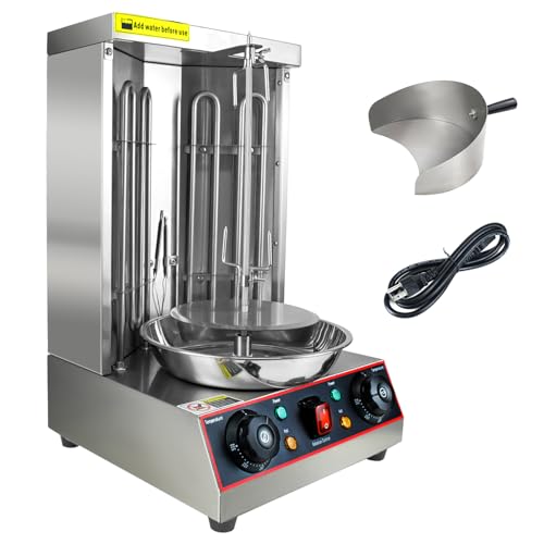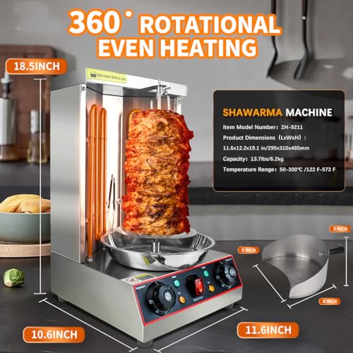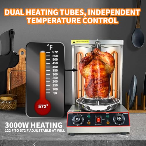 This shawarma grill has 3000w of power and a rotisserie for more even heating and more flavorful cooked ingredients. The knob controls the temperature level, you can use different temperatures for different ingredients.